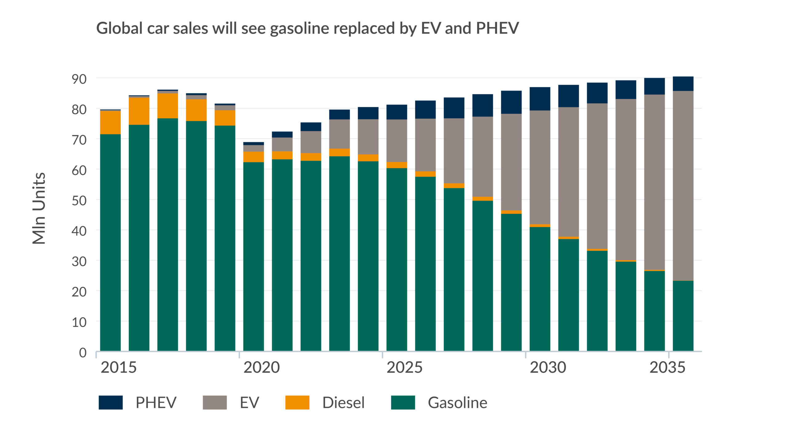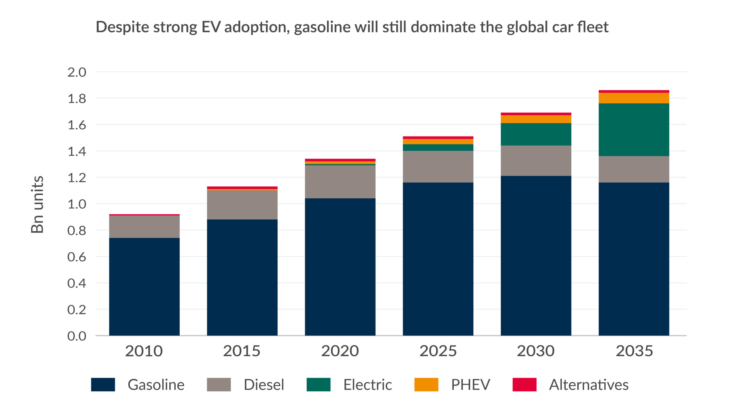 Whilst we anticipate the trajectory of EV vehicles to steadily rise, Vitol expects gasoline to continue to dominate the global car fleet in the coming decade – PHEV’s are essentially a more efficient gasoline vehicle – with ICE units totalling more than 1 billion in 2035, on par with 2025, and EVs only making up one-third of the fleet.