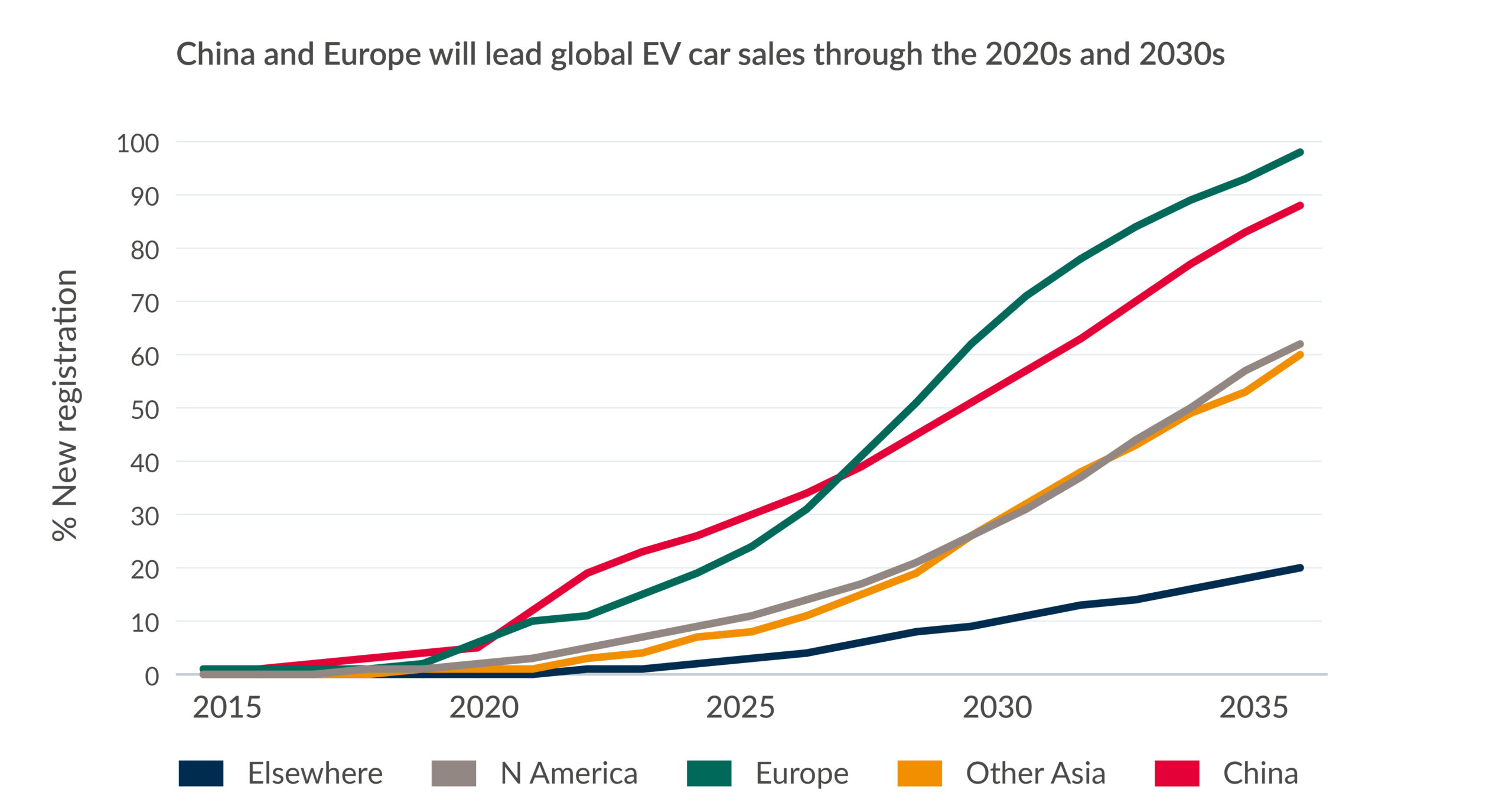 Leading this EV evolution will be Europe and China, with an EV market share of new car sales forecast at 90% and 80%, respectively by 2035. The US by contrast is forecast to have more than 50% market share over the same period. There are several factors for the disparity in EV uptake. China has a younger car fleet, due to relatively recent urbanisation and economic growth, and the average distances travelled is – similar to Europe – much shorter than those seen in the US.